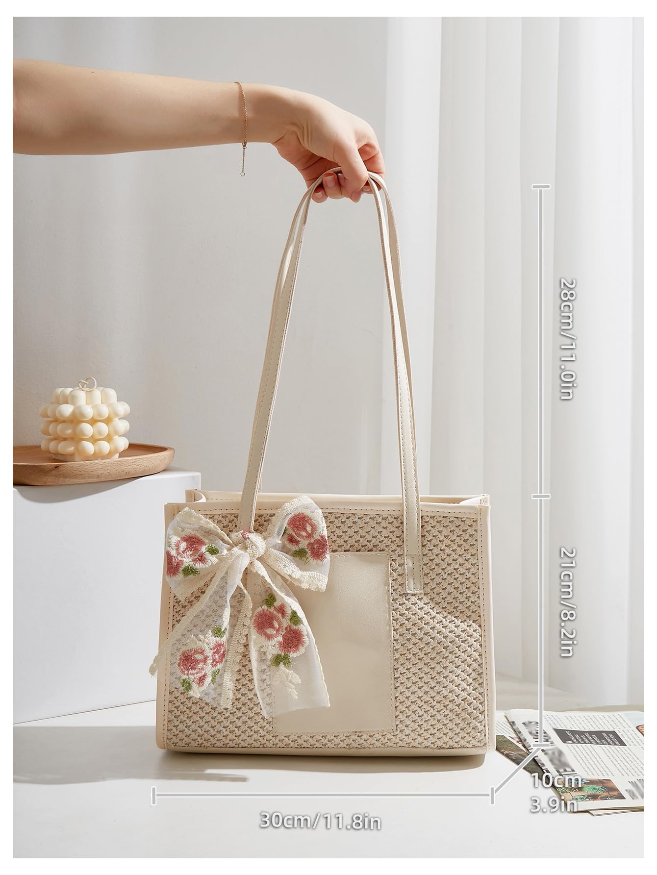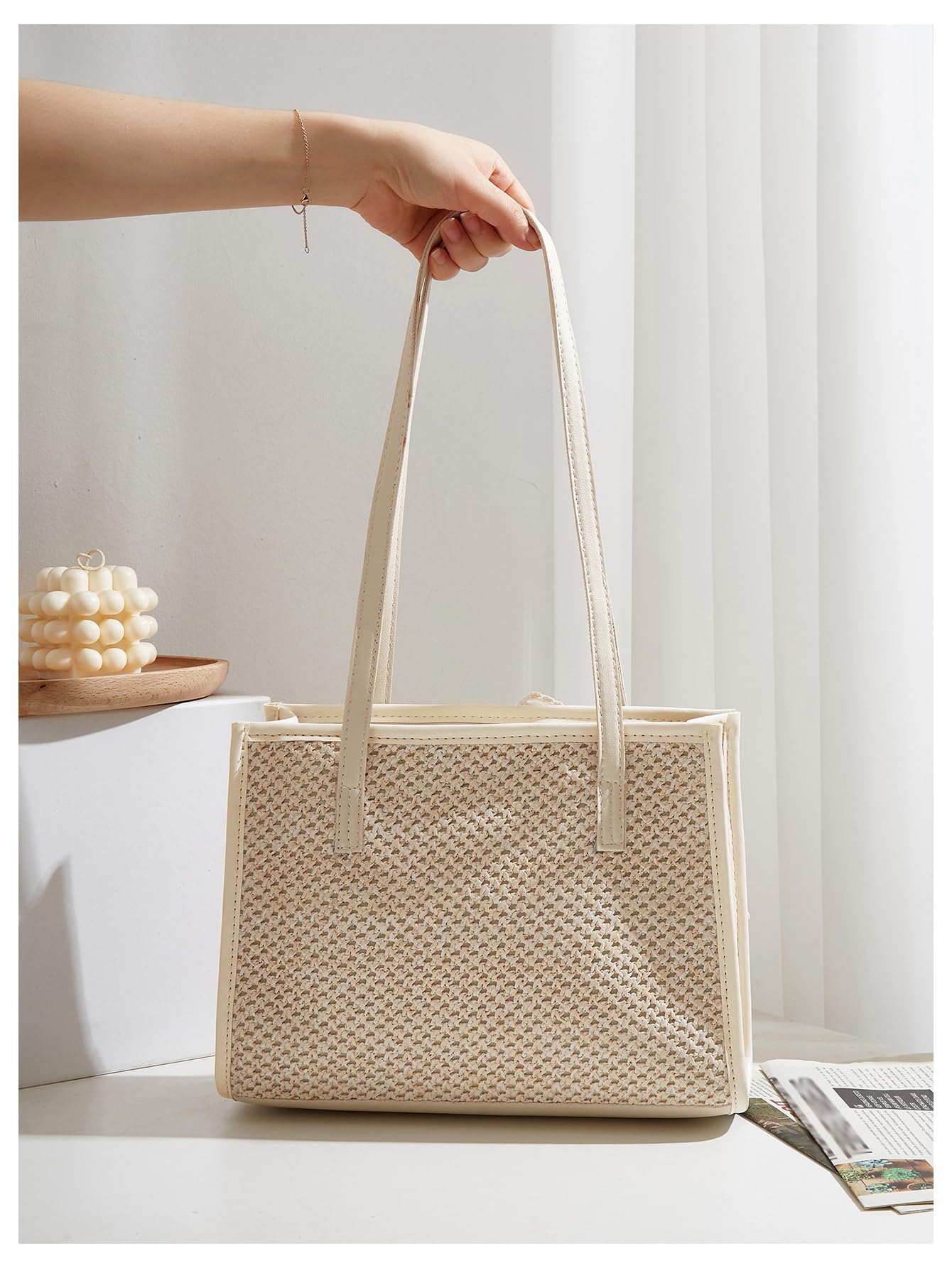 Material: Made with a woven straw-look exterior and smooth faux leather trim, this tote bag offers a light, textured look with a soft and elegant finish.