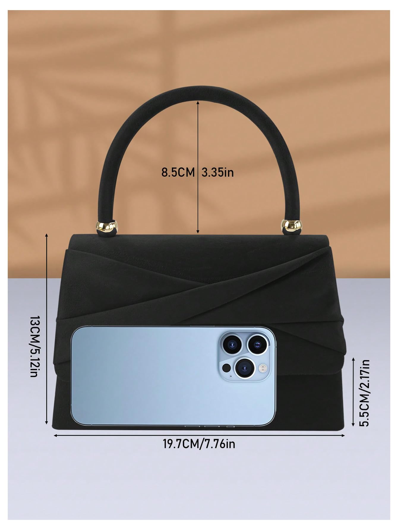 Size: Approx. 19.7 cm / 7.76 in (L) × 5.5 cm / 2.17 in (W) × 13 cm / 5.12 in (H), with a handle height of about 8.5 cm / 3.35 in. Suitable for carrying small essentials such as your phone, cards, keys, and lipstick.
