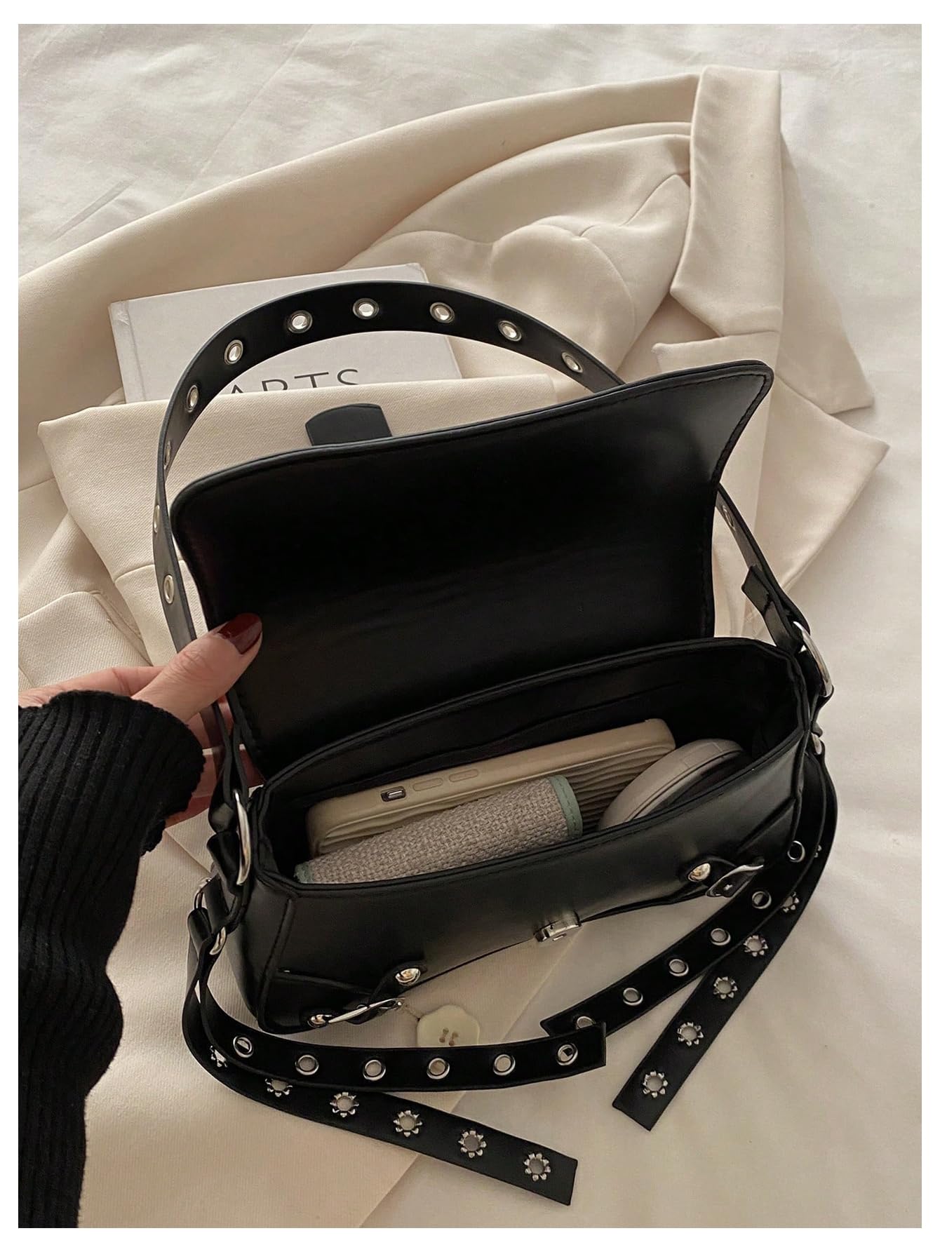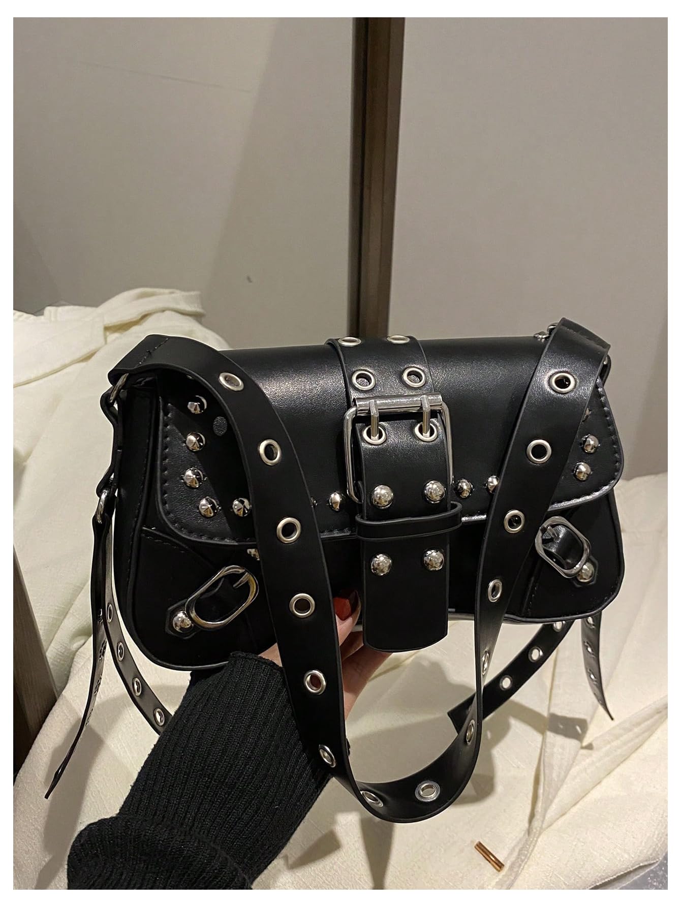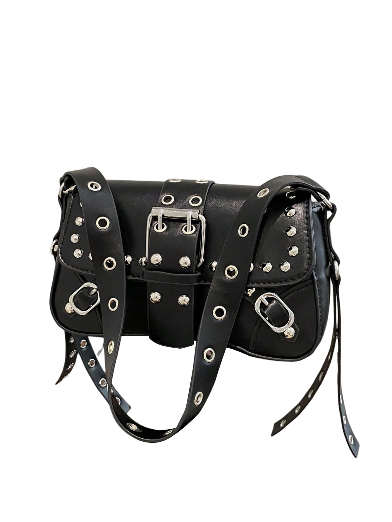 Design: Featuring a structured flap silhouette, this bag stands out with bold buckle details, silver-tone studs, and eyelet accents for a cool punk-inspired look.