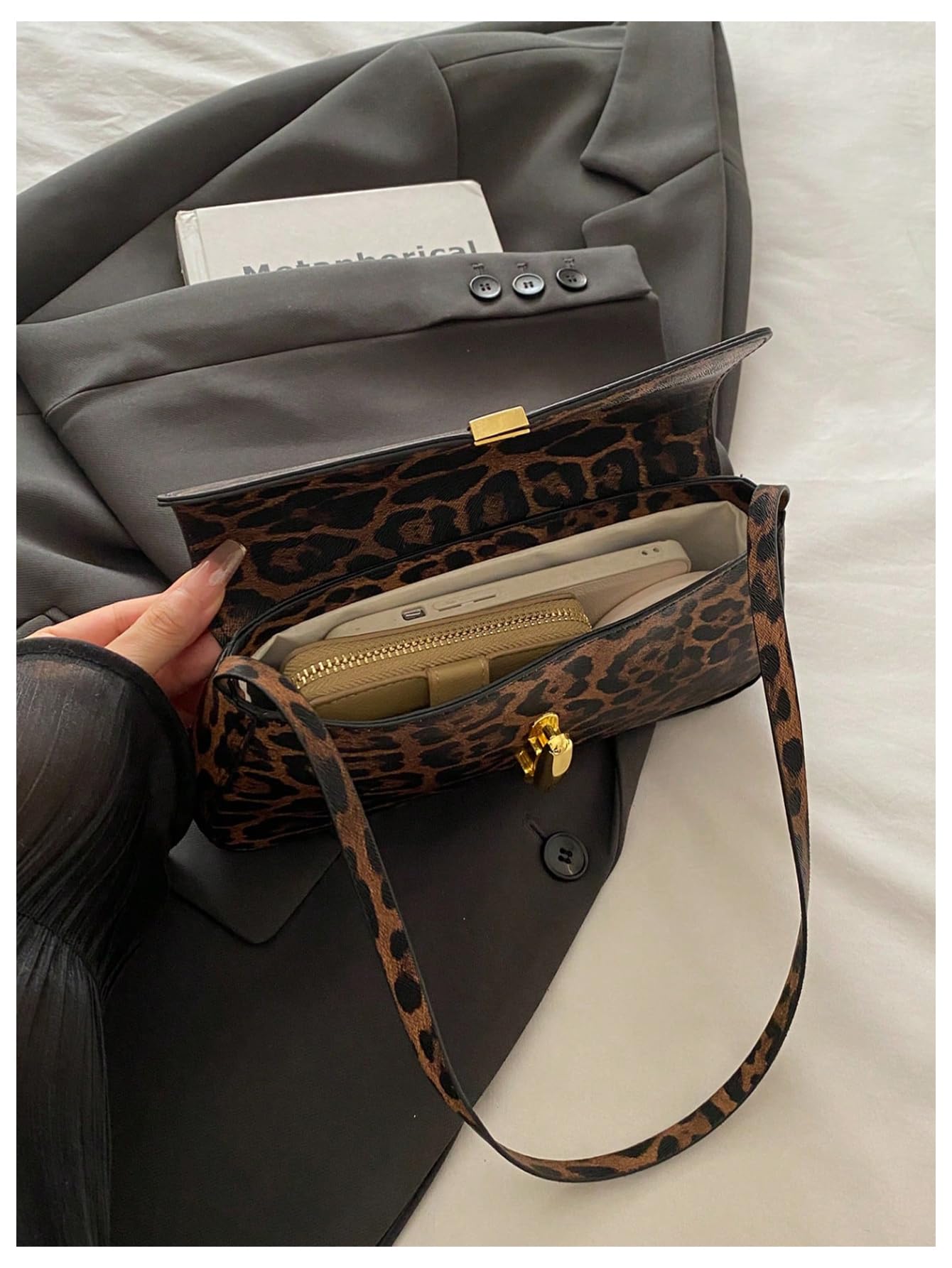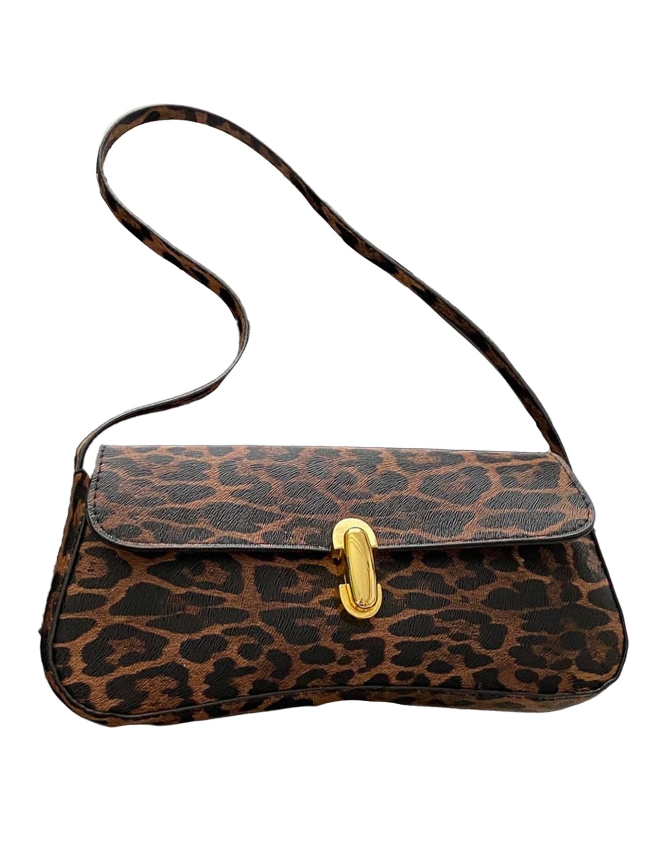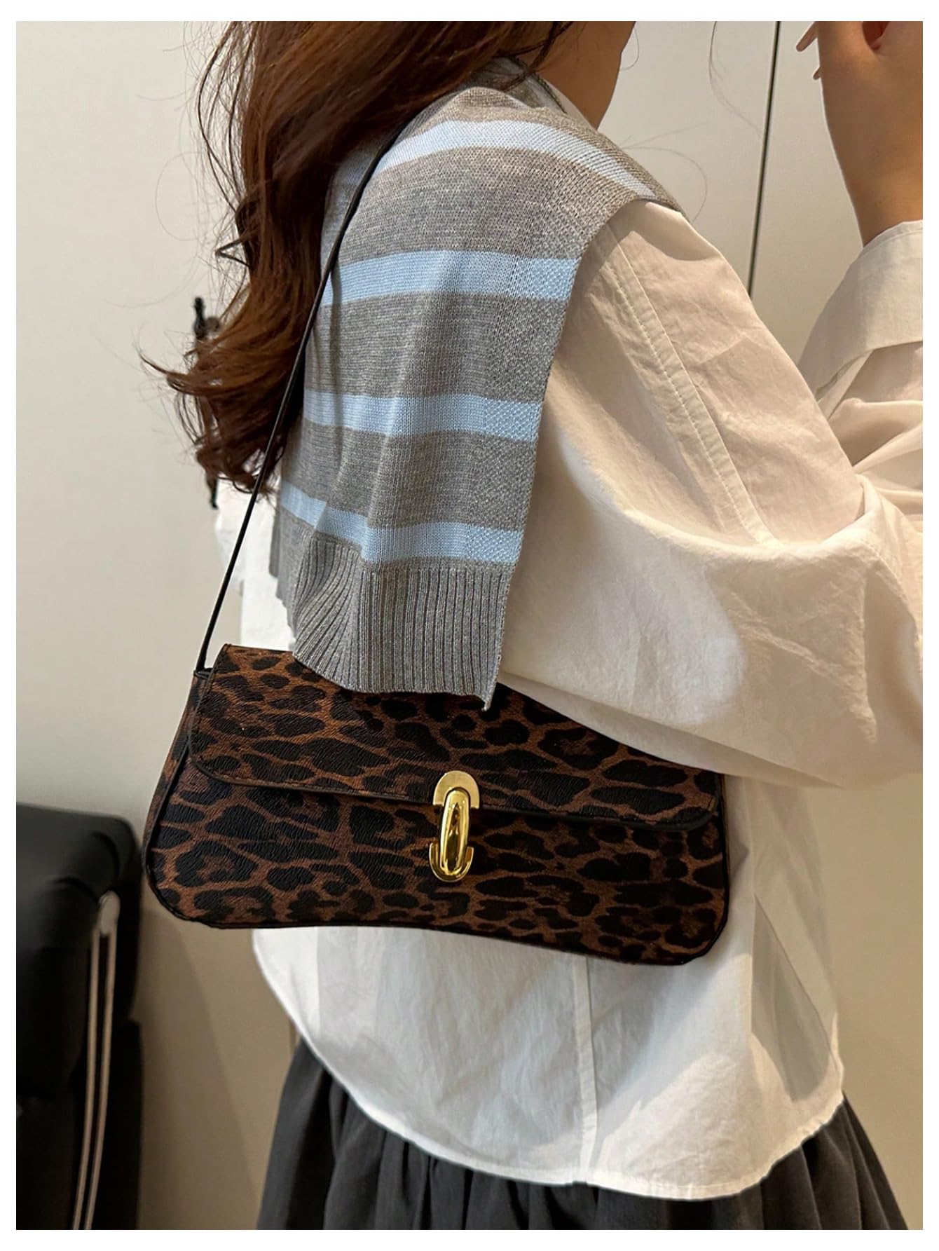 Material: Made with a smooth faux leather exterior, this shoulder bag features a rich brown leopard print pattern that adds a bold and stylish touch to the overall look.