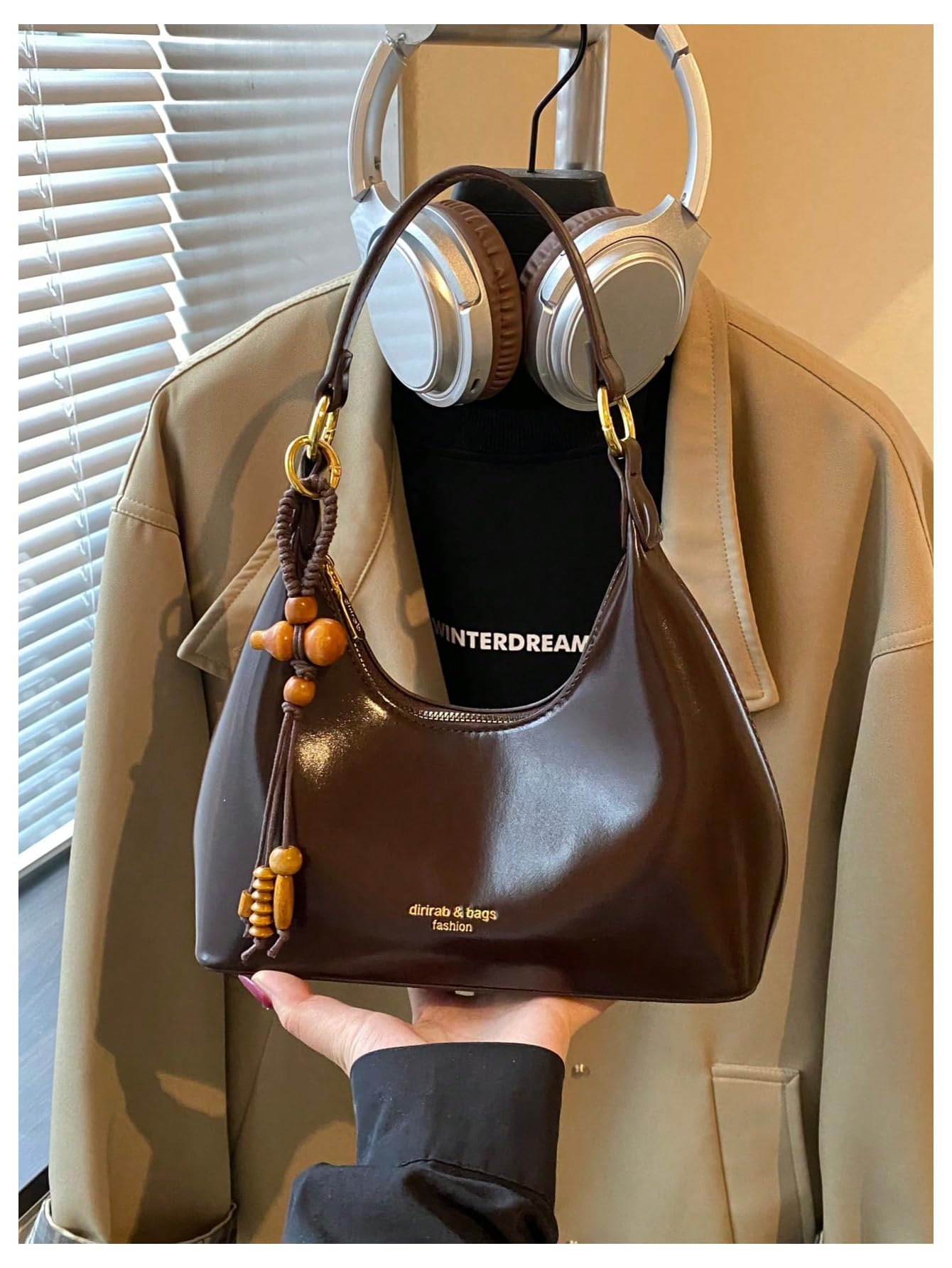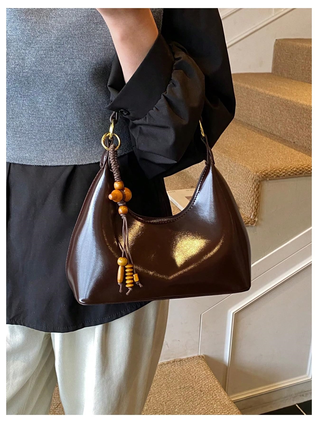 Decorative Detail: Finished with a hanging wooden bead and tassel charm, adding a warm, stylish accent to the simple design. Gold-tone hardware gives the bag a refined touch.