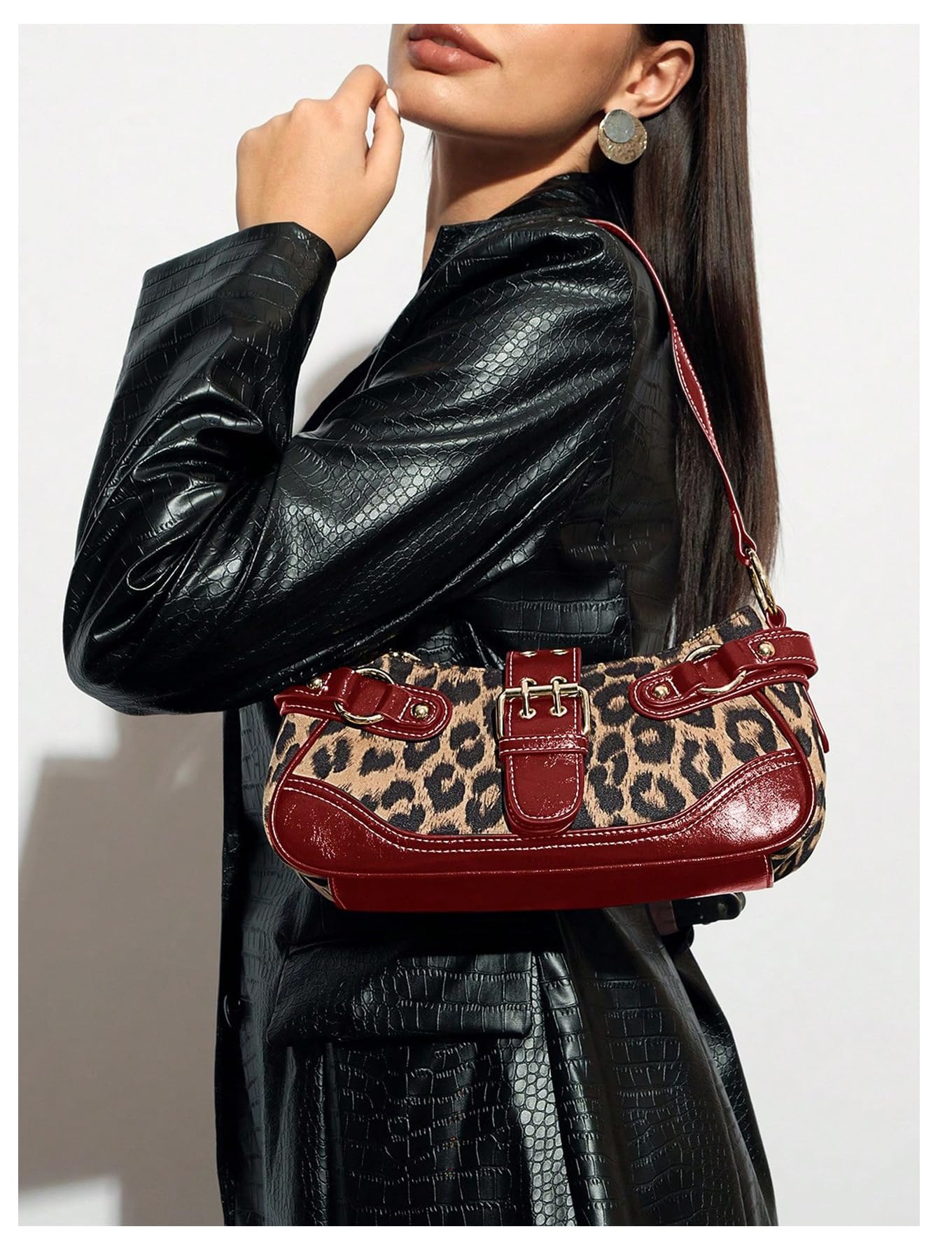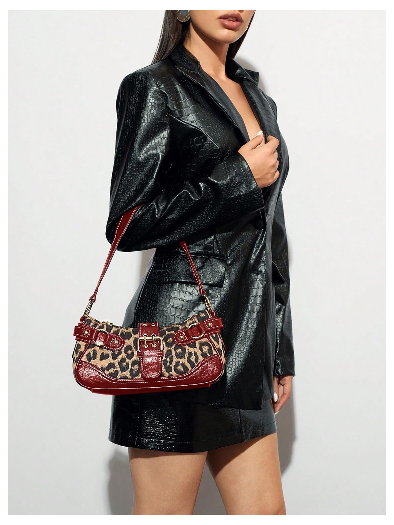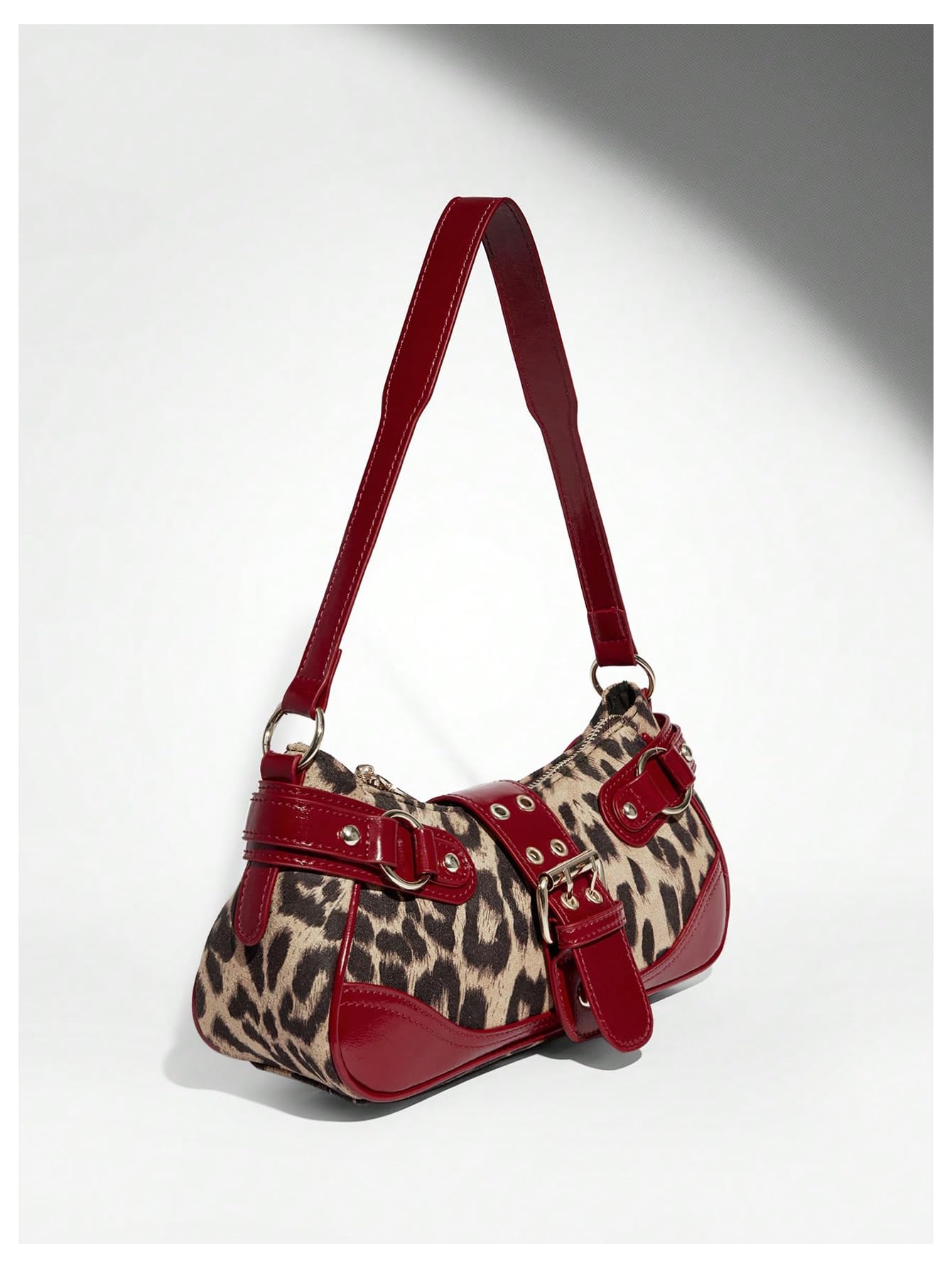 Material: Made with a faux leather and fabric-look exterior, this shoulder bag features a bold leopard print body with red trim for a striking vintage-inspired look.