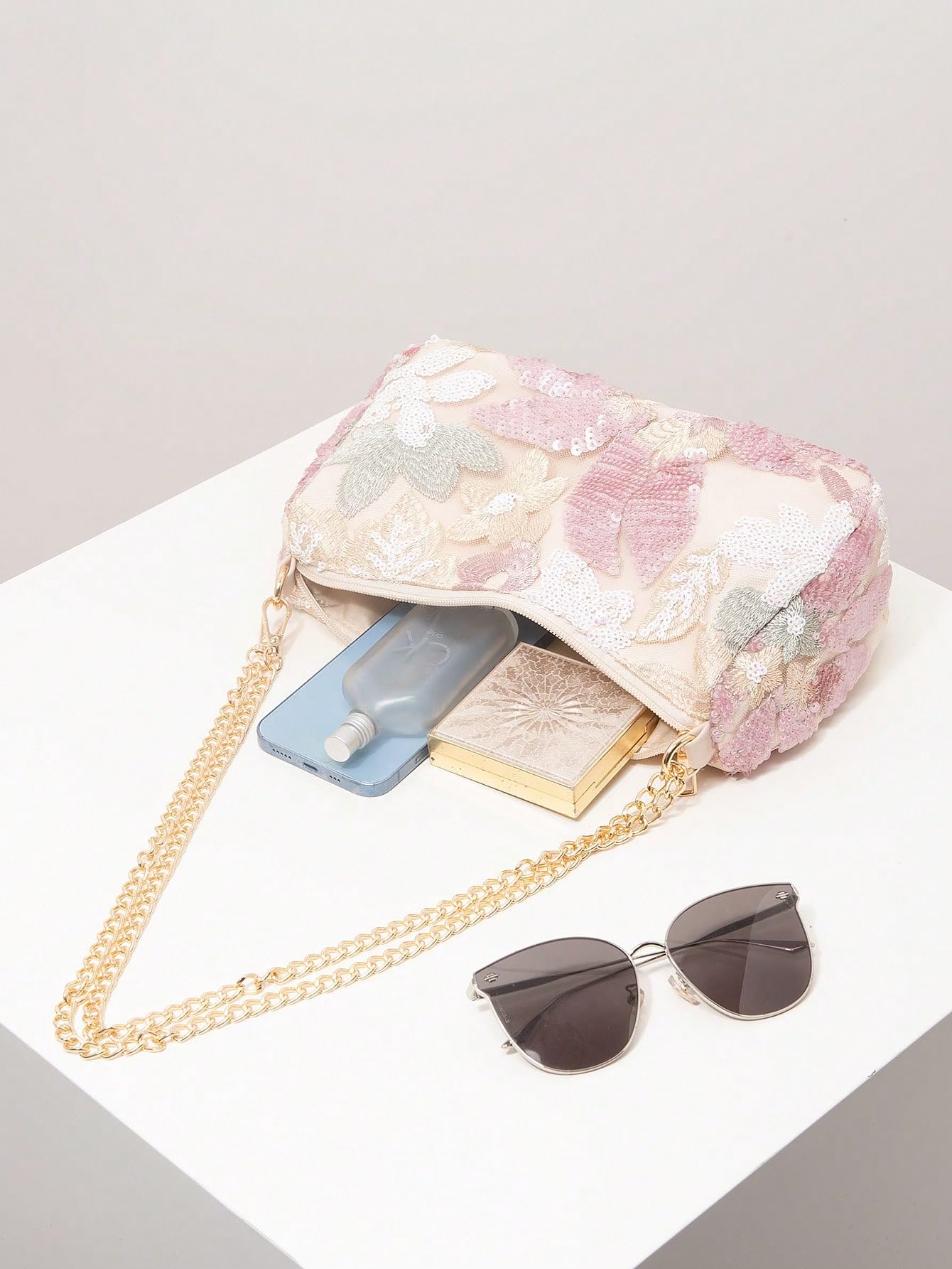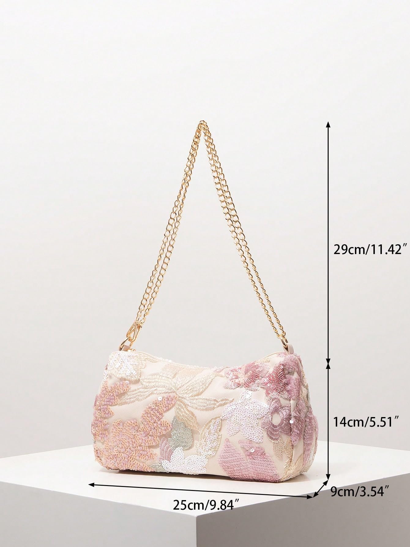 Pink Floral Tapestry Shoulder Bag with Chain Strap